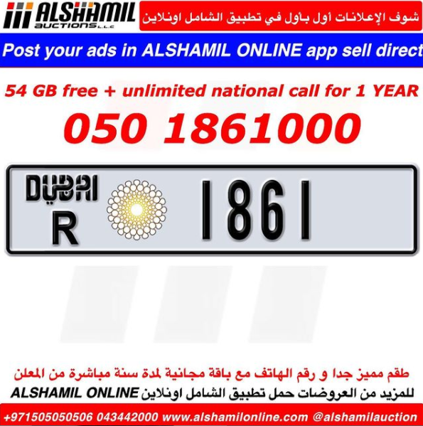 Description:Etisalat Number 050 1861000 available same R 1861 54 GB free+unlimited national call for 1 year For booking call 0505050506